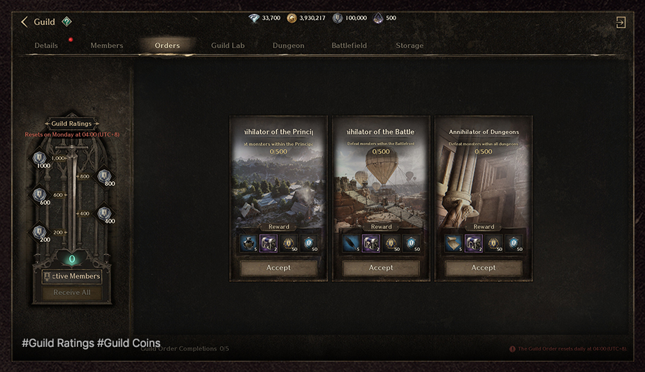 ⦁ Select the Guild Order of your choice among the three that are available. There is a base of 5 Guild Orders that you can complete, daily.