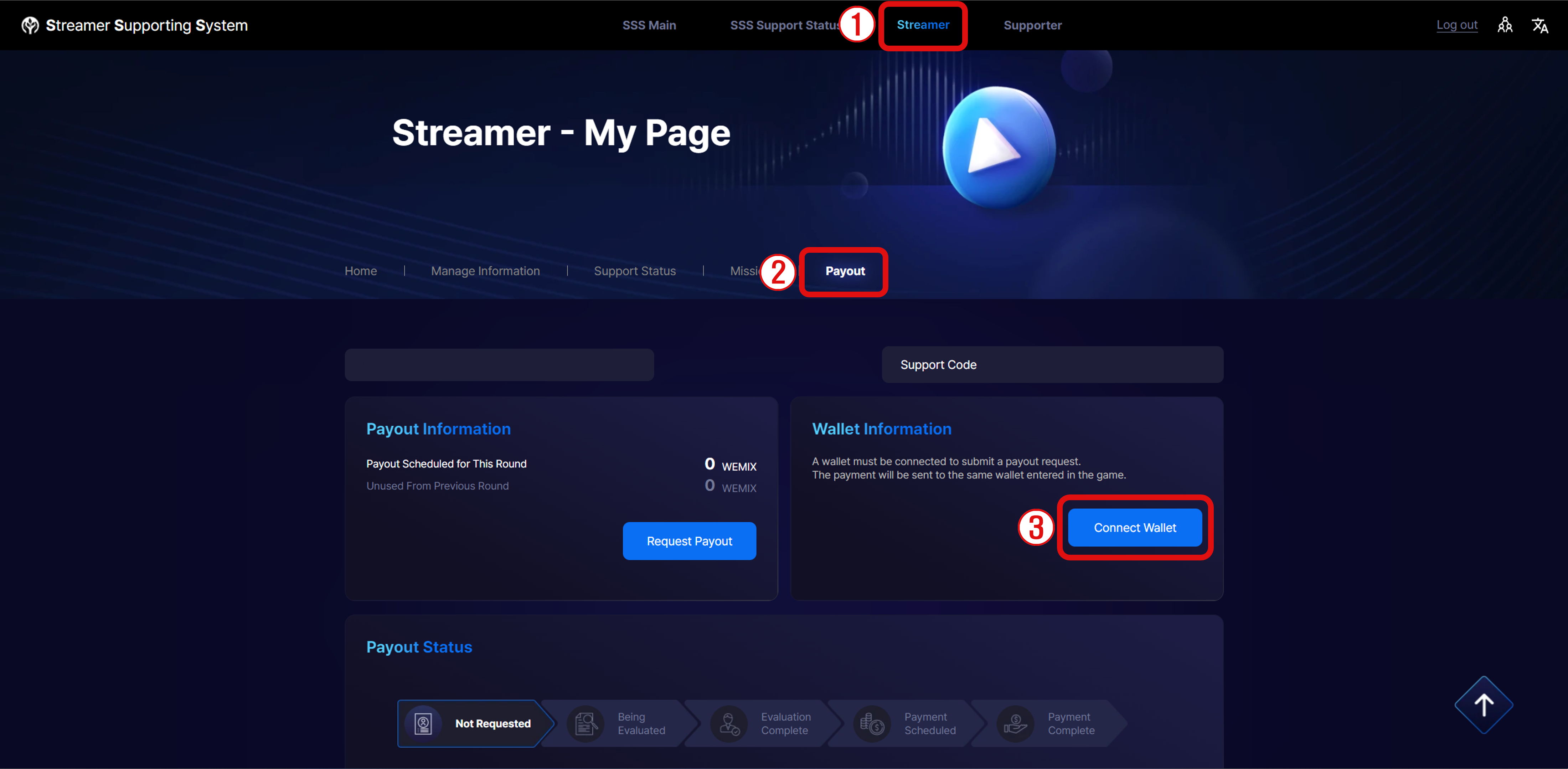 • SSS Page - STREAMER Log in to your Streamer account - My Page - Select [Payout] tab